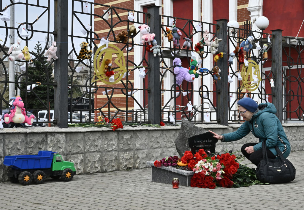 8 апреля люди несут цветы к вокзалу, где в 2022 году погиб 61 человек. Фото: GENYA SAVILOV/AFP via Getty Images