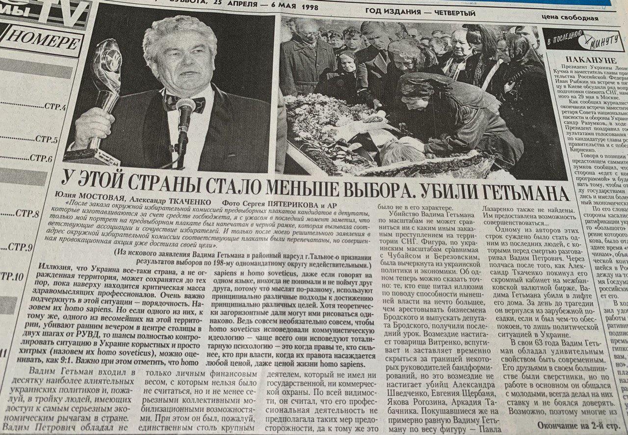 Одно из самых громких политических убийств произошло 22 апреля 1998 года. В грузовом лифте многоквартирного дома на столичной улице Суворова с шестью пулевыми ранениями обнаружили бывшего главу Нацбанка Украины Вадима Гетьмана. Через четыре года убийца назвал себя сам, но имя заказчика жестокого преступления до сих пор не названо.