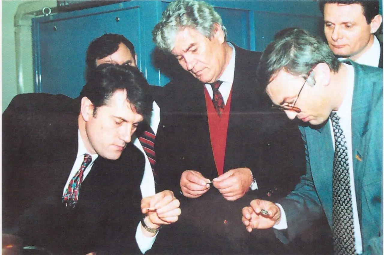 Народный депутат и экс-председатель НБУ Вадим Гетьман, тогдашний глава Нацбанка Виктор Ющенко и нардеп Владимир Стретович держат первые монеты независимой Украины, 1996 г. Фото: ФБ Украинский институт национальной памяти