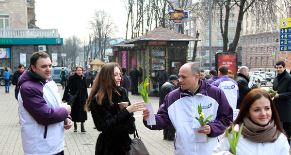 В канун праздника 8 марта в крупных городах Украины мужчины от имени Общественного движения "Украинский выбор" поздравляли женщин с праздником Весны и дарили цветы.
