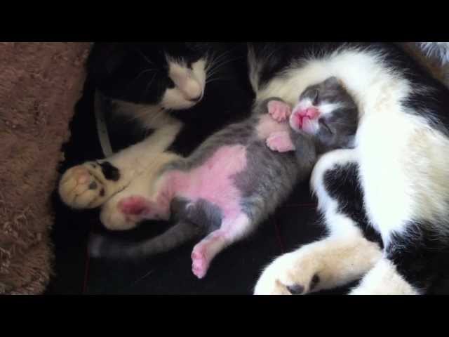 В ролике видно, как маленький котенок смешно шевелит лапками и хвостом во время сна.