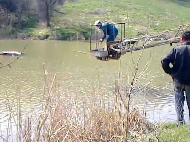 38-летний Леонид, водитель автокрана одной из запорожских фирм, подъехал к берегу озера на Правом берегу на автовышке. Удобно припарковался, и сел за рычаги управления. За пару минут он вытянул стрелу, на которой висели рыболовные снасти. Дальше мужчина опустил с помощью техники сетку в воду (паук), насыпал приманку, при этом грациозно прошелся как акробат по стреле и стал цедить воду.