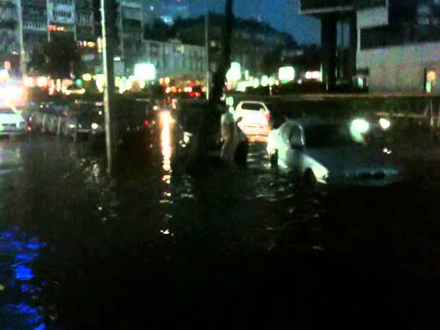 Масштабные "озера" образовались в разных районах города, в частности - в районе станции метро Черниговская, на улице Эспланадной в центре города, а также на центральном автовокзале на Московской площади. Видео: Игорь Верютин