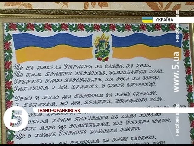 Картину размером почти полтора на полтора метра вышила крестиком крымчанка Ольга Пеця. На картине – текст национального гимна Украины, три куплета и припев. Обрамляют гимн гроздья калины, сверху – флаг и герб.