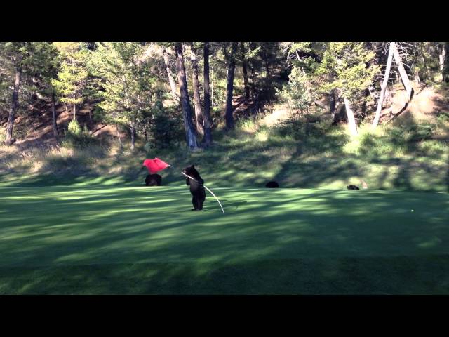 Одно из лучших полей для гольфа в Канаде облюбовали четыре маленьких медвежонка. А один из принялся играться флагштоком у лунки. Причем игривый детеныш даже успел перехватить мяч одного из игроков.