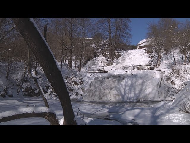 Отмечается, что из-за заморозков ледяная корка покрыла почти весь водопад, а из-за перепадов температур плотность льда осталась неравномерной.