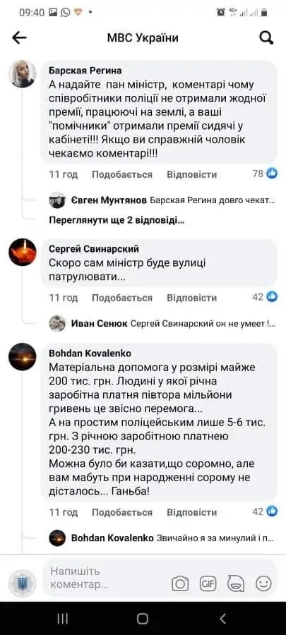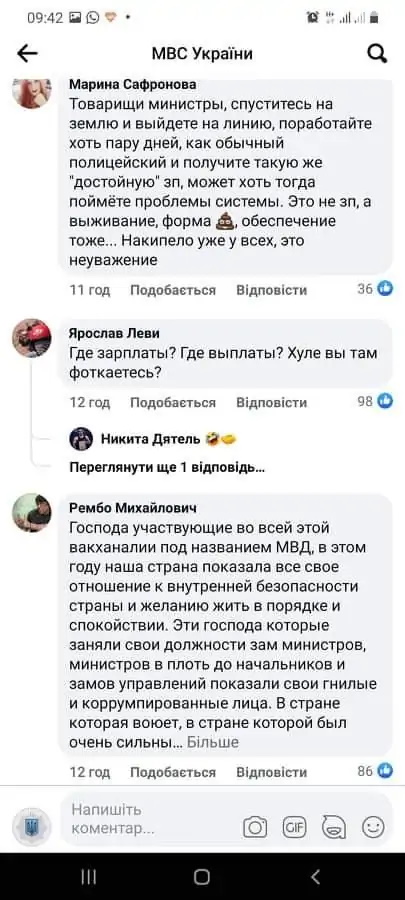 «МВД Украины, где наши деньги? Когда будет выплата? Где ковидная помощь? Почему некоторые кадры при выходе получают миллионные выплаты, а некоторые – тысячи? Почему прокуроры получили +100 к праздникам? Почему руководители МВД получили по 100к+ помощи? Вы самая гнилая структура! Готовьте заборы, скоро они вам понадобятся», – написал один из полицейских.