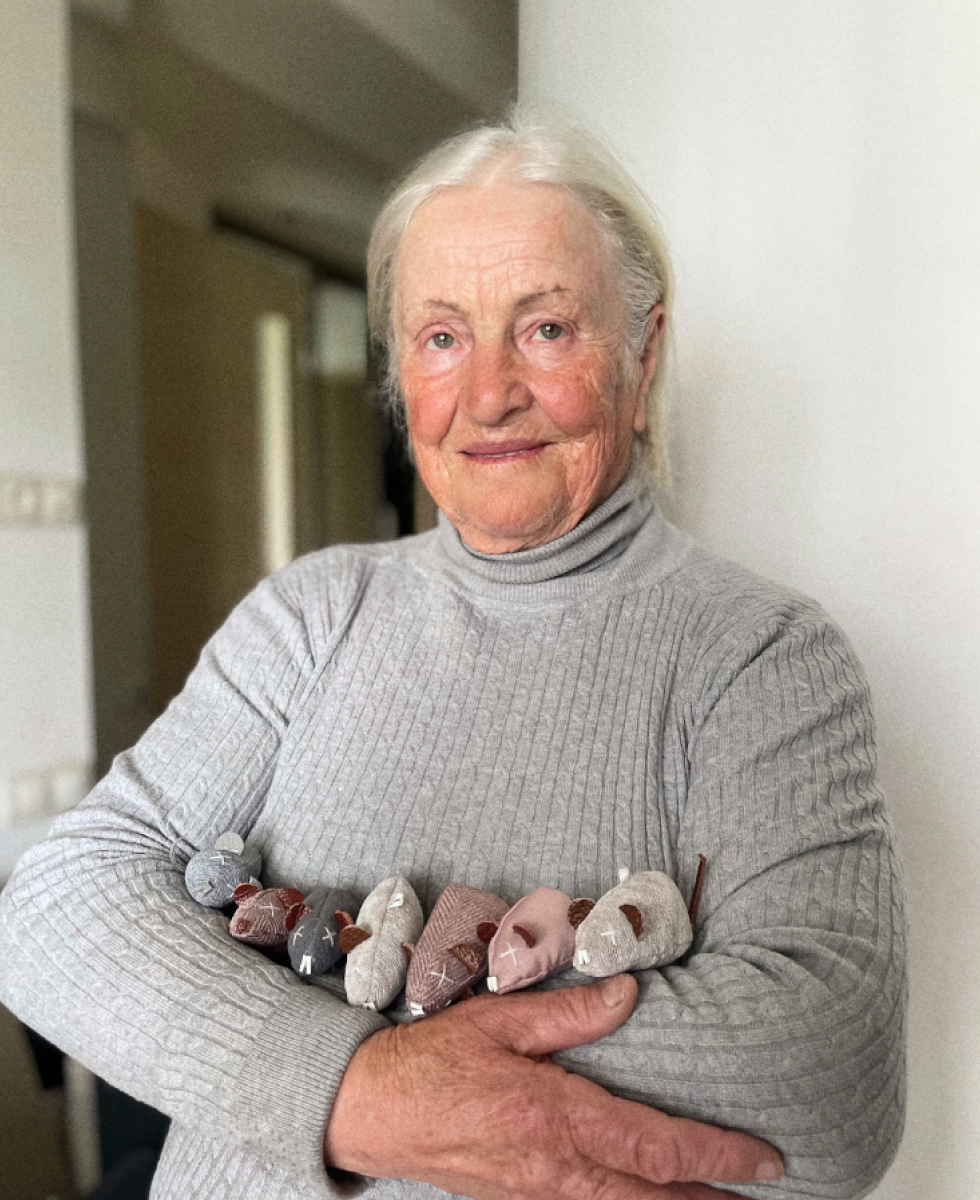 83-летнюю Анну Ивановну выгнала из родного Николаева - война. Помыкавшись какое-то время, женщина осела в Киеве, а чтобы не слишком тосковать по дому и заработать хоть какую-то копейку, начала шить мягких разноцветных мышек.