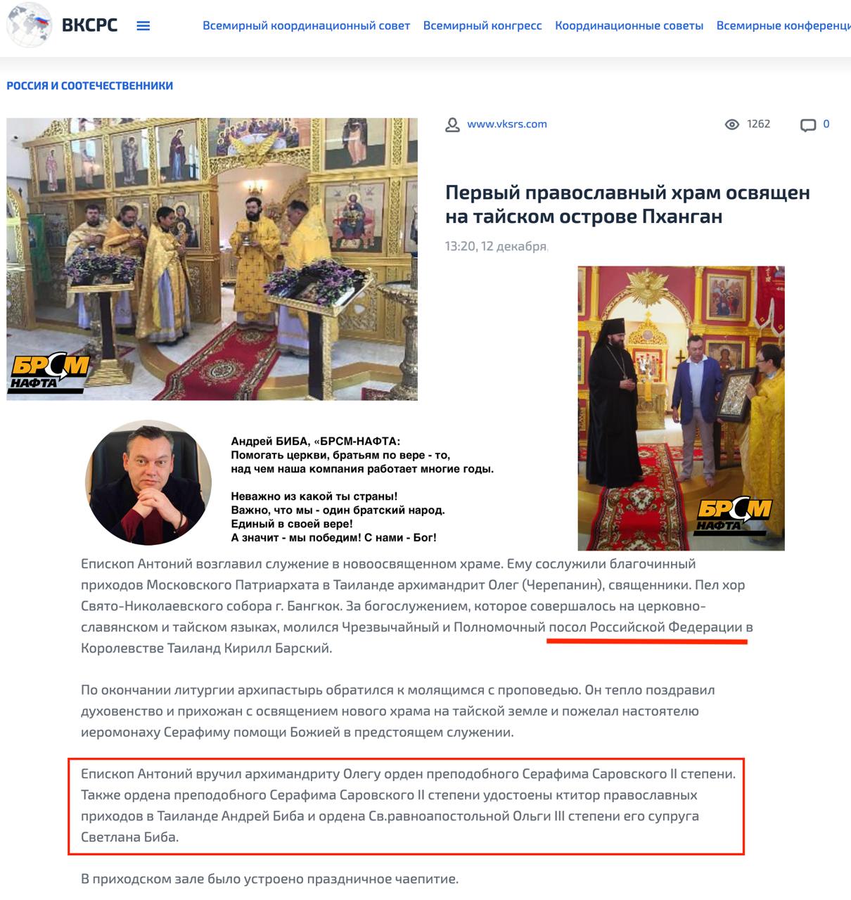 По данным журналистов, в сентябре 2023 года, во время одной из служб, митрополит УПЦ МП Ириней передал Андрею Бибе икону святителя Спиридона Тримифунтского с памятной грамотой. За год до того (т.е. через полгода после начала полномасштабки) этот же митрополит передал владельцу «БРСМ-Нафта» икону Божьей Матери «Казанская» как благодарность за труд по делу строительства верхнего храма в честь святителя Спиридона, епископа Тримифунтского, в пос. Опытное Днепровского района Днепропетровской области.