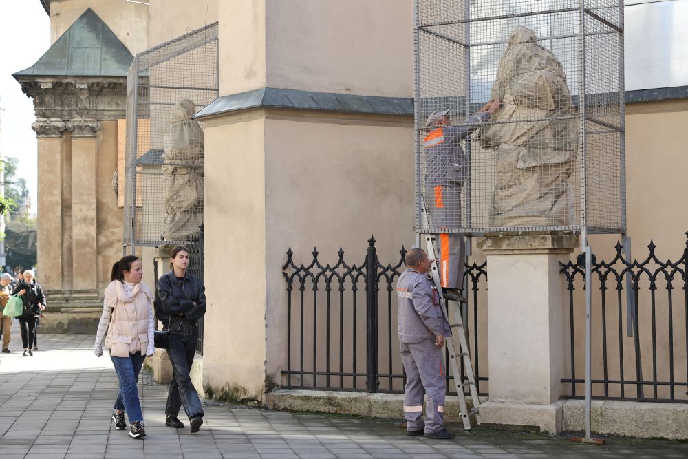 В центральной части Львова достопримечательности «упаковали» в фанеру, мешки с песком, пожароустойчивые ткани, леса. Фото: city-adm.lviv.ua