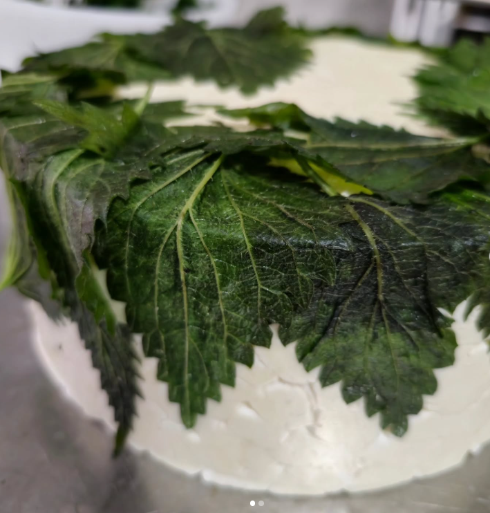 Еще один необычный сыр от Натальи Ковач - крапивный. Его также раньше никто не производил в Украине, но позже у мастера уже появились последователи. Это сыр, созданный по технологии английского полутвердого сыра "Ярг". В процессе приготовления он оборачивается листьями крапивы.