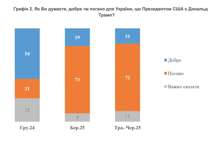 - По состоянию на май-начало июня 2025 года восприятие Д. Трампа практически не изменилось. Сейчас 72% считают, что это плохо для Украины, что президентом США стал Д. Трамп. Только 16% считают, что это хорошо, - говорится в сообщении.