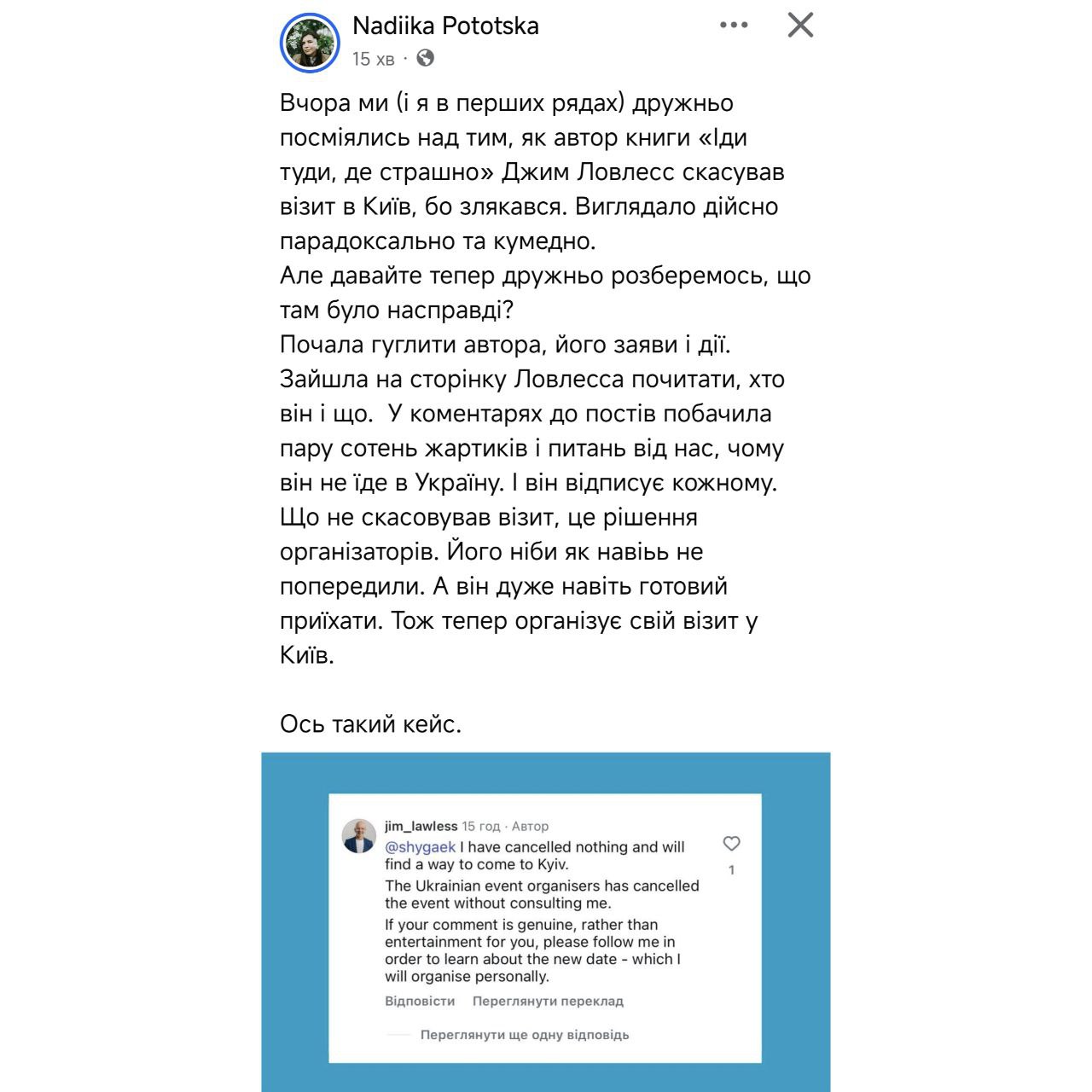 На комментарий Джима Лоулесса обратила внимание консультант по стратегическим коммуникациям Надежда Потоцкая. В своем Facebook она рассказала, что автор бестселлера отвечает на все комментарии об отмене встречи в Киеве.