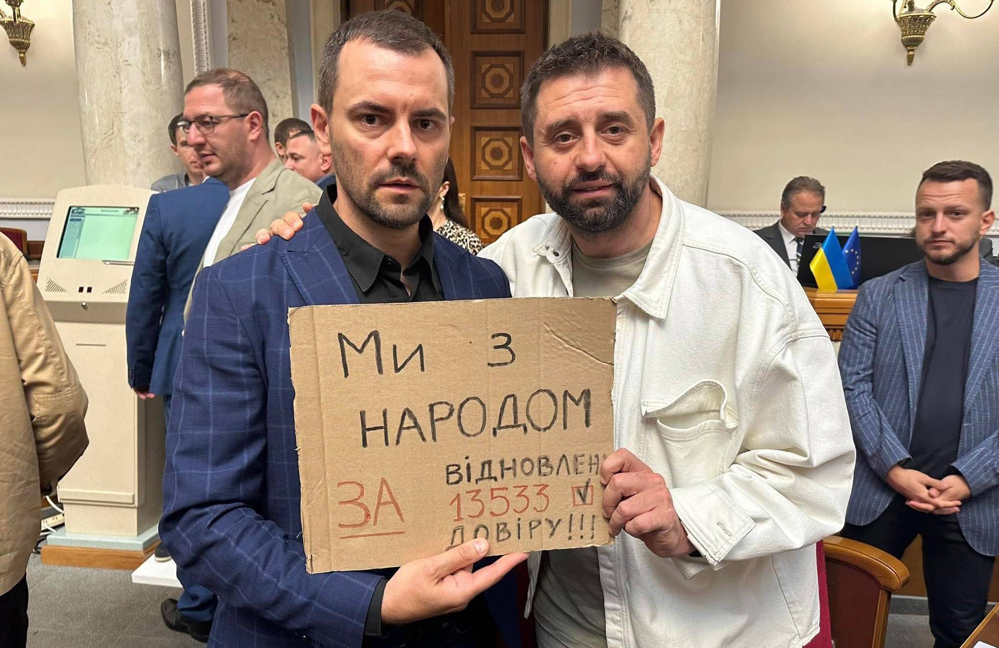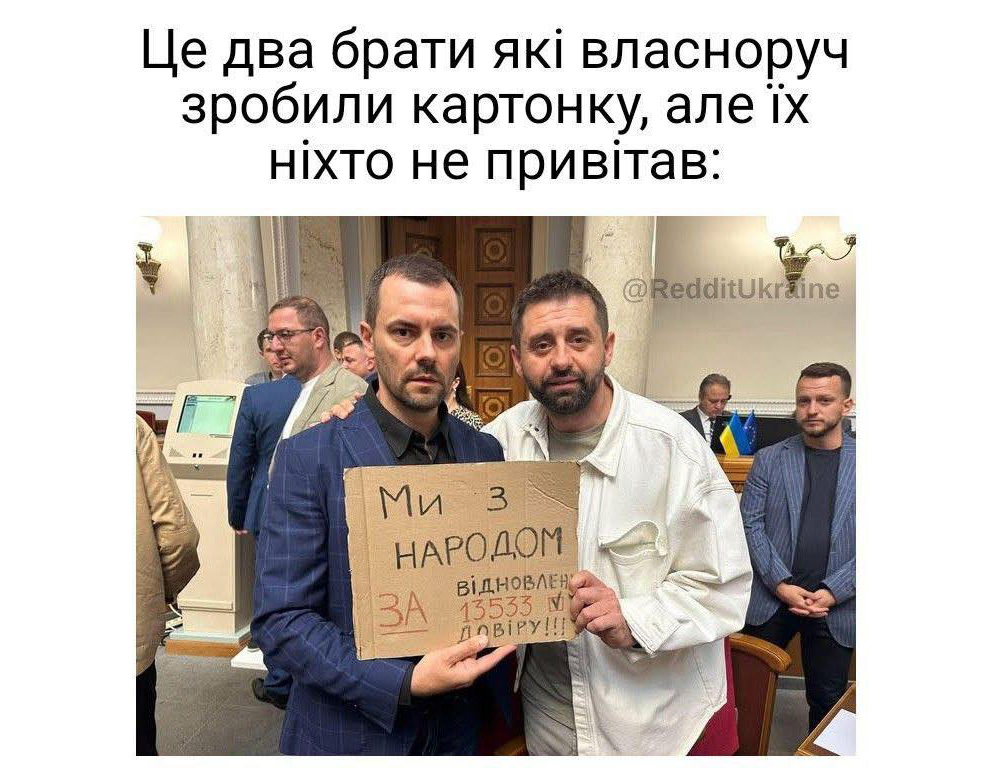 А это, несмотря на подпись сверху – не фотошоп, и не ШИ. Это реальное фото – народные депутаты от «СН» Александр Мариковский и Давид Арахамия перед голосованием за законопроект №13533.