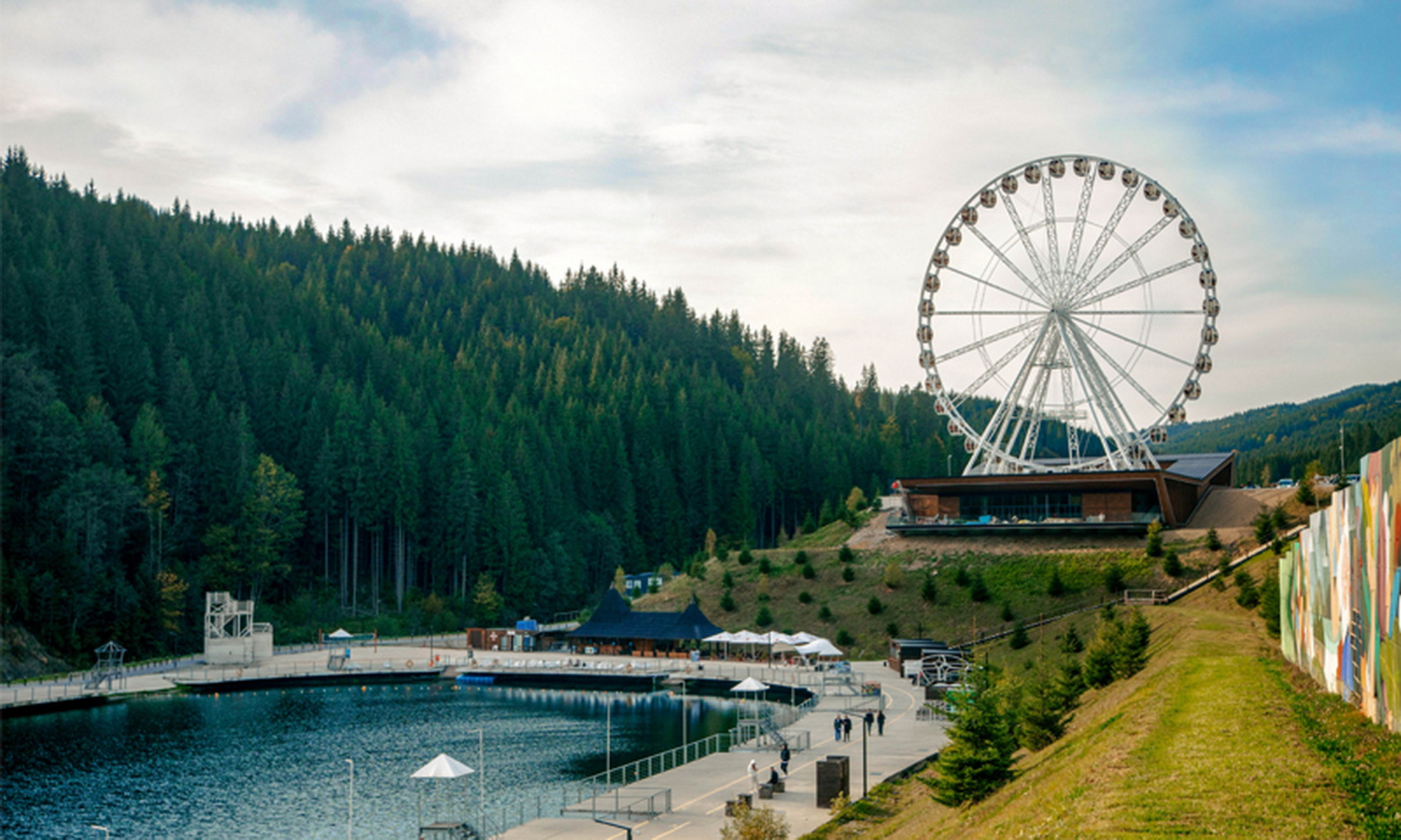 Посмотреть на горы сверху летом – это совсем не то, что зимой. Тут доступны для обзора не только снег и верхушки елок, но и все остальные, скрытые зимой белым покрывалом красоты. Высота колеса обозрения – 45 метров. Неплохо, но все же как бы хозяевам комплекса не хотелось считать его самым высоким в стране, позволить себе такое мнение можно только за счет гор – харьковское колесо обозрения обгоняет буковельское на десять метров. Киевское чуть отстает – но только на два метра. Так или иначе, а все же с колеса обозрения вы увидите незабываемую панораму – не бетонные джунгли с вечерними огнями или старые хрущевки, а живописные летние пихты и ели Карпат. Кататься предлагают в закрытых кабинах с панорамными стеклами, что позволит видеть все на 360 градусов вокруг.
