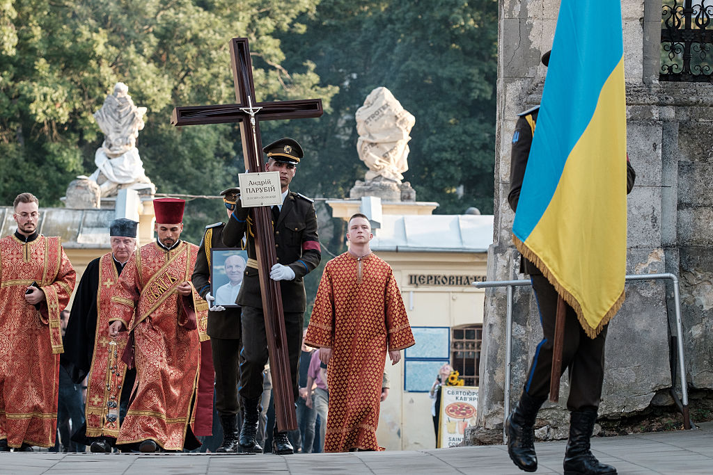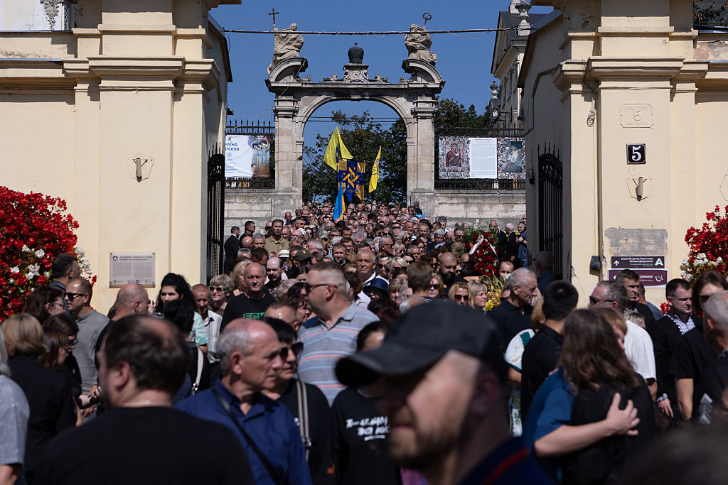 Чин похорон Андрея Парубия начался в 12:00 в Архикафедральном соборе святого Юра. Люди начали собираться на территории храма более чем за час до начала.