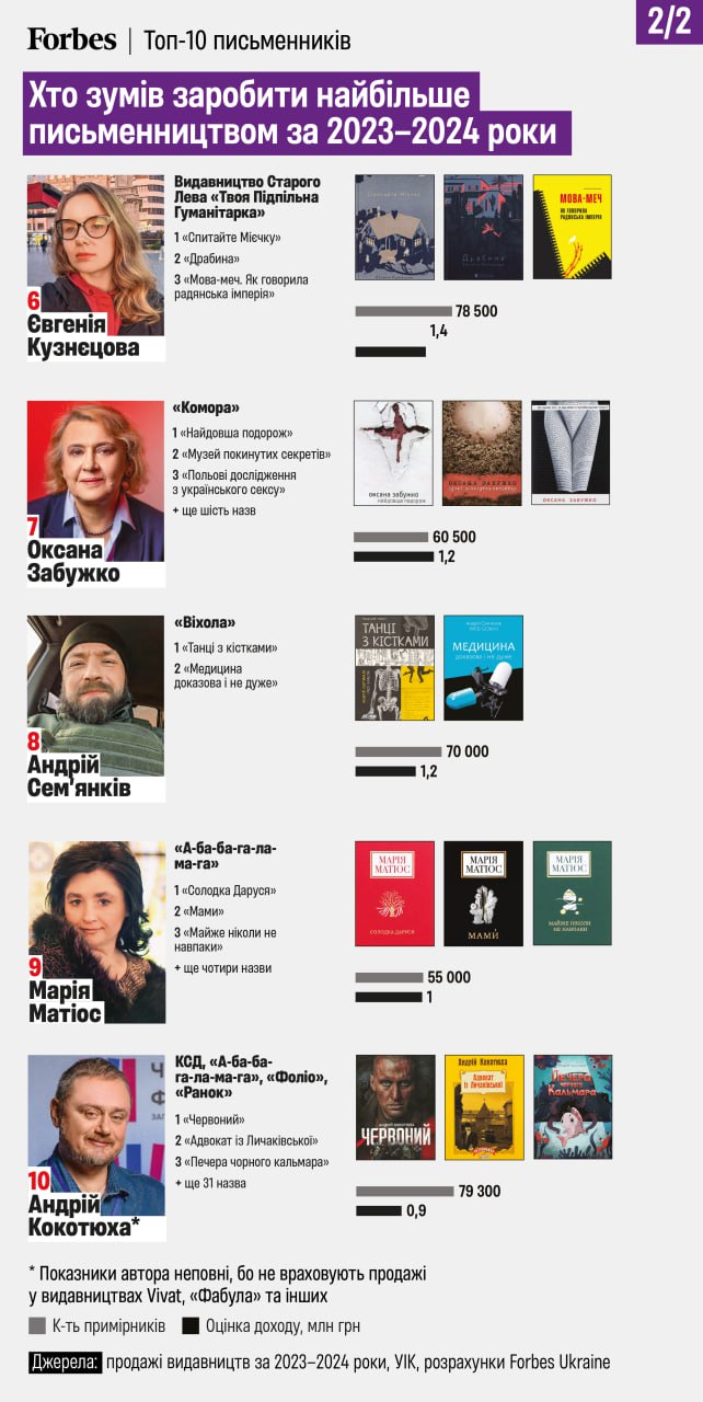 Замыкает тройку лидеров живой классик украинской литературы Лина Костенко. На ее счету 96 тыс. проданных экземпляров, принесших ей почти 1,9 млн. грн.