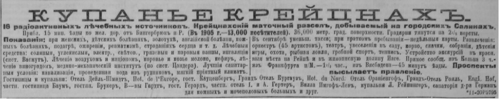 Вниманию клиентов предлагается курорт Крейнцнах (Kreuznach, ныне Бад-Кройцнах). Главная его фишка - 16 радиоактивных лечебных источников (радиоактивность тогда считалась целебной новинкой, о ее вреде сначала никто и не думал). Утверждается, что они могут помочь при лечении ревматизма, подагры, болезней сердца, анемии, туберкулеза, «английской болезни» (рахита), нервных заболеваний и так далее. При этом используется широкий спектр процедур: соляные, углекислые, серные, грязевые и паровые ванны, ингаляции, молочные и сывороточные диеты.