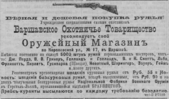И в полной мере это окно открывалось уже в Варшаве. Нынешняя столица Польши на стыке XIX–XX веков административно относилась к Российской империи, хоть и имела автономные привилегии и считалась пограничным с европейским миром городом. Добраться из Киева туда было относительно просто и быстро. Без пересечения границ, чуть больше чем за сутки на поезде. Ехали сюда по причинам, схожим на современные - учиться, по делам бизнеса, на шопинг. Да-да, в варшавских магазинах был куда более широкий ассортимент товаров, чем в Киеве. Сказывалась приближенность к центру Европы. В газете «Киевлянинъ» за 1905 год находим объявление - рекламу «Оружейного магазина Варшавского охотничьего товарищества». В нем делается упор на огромный ассортимент: «постоянно на складе 5000 штук ружей первоклассных мастеров» (перечислены европейские бренды - Пердэ, Гринер, Голланд и др.). При этом в перечне предложений - от дешевых ружей (55 рублей - средняя месячная зарплата киевского чиновника. - Прим. авт.) до дорогих марок («шведские безкурковые ружья», «системы Браунинг» и т. д.). Газеты пестрели подобными предложениями в рекламе других товаров - от дамских сумочек до мебельных гарнитуров.