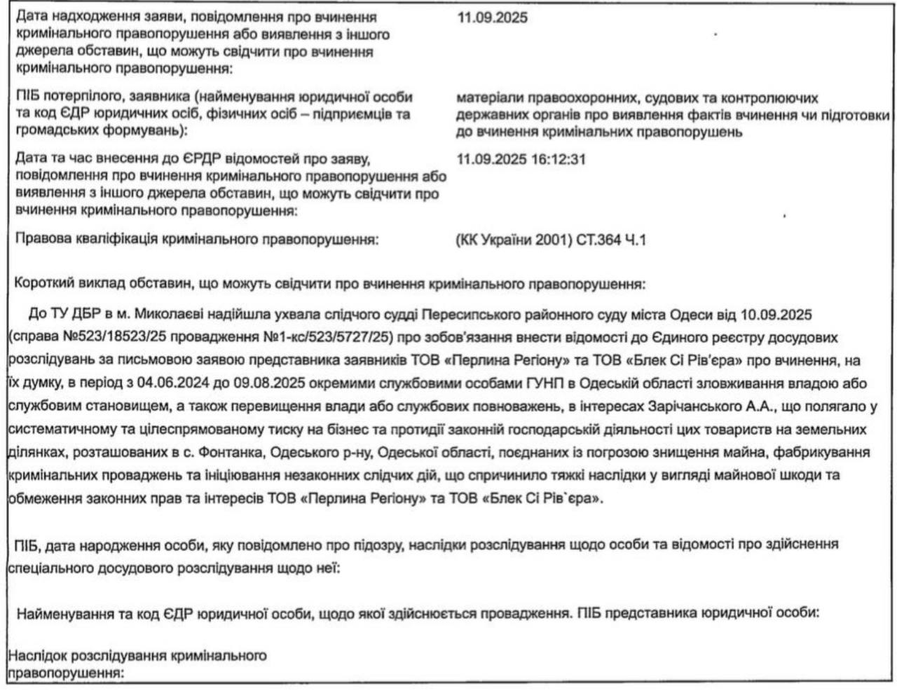 Как следует из документов ДБР, 11 сентября 2025 года, на основании решения Пересипского районного суда Одессы, в ЕРДР были внесены сведения о возможных преступлениях отдельных служебных лиц ГУНП в Одесской области.