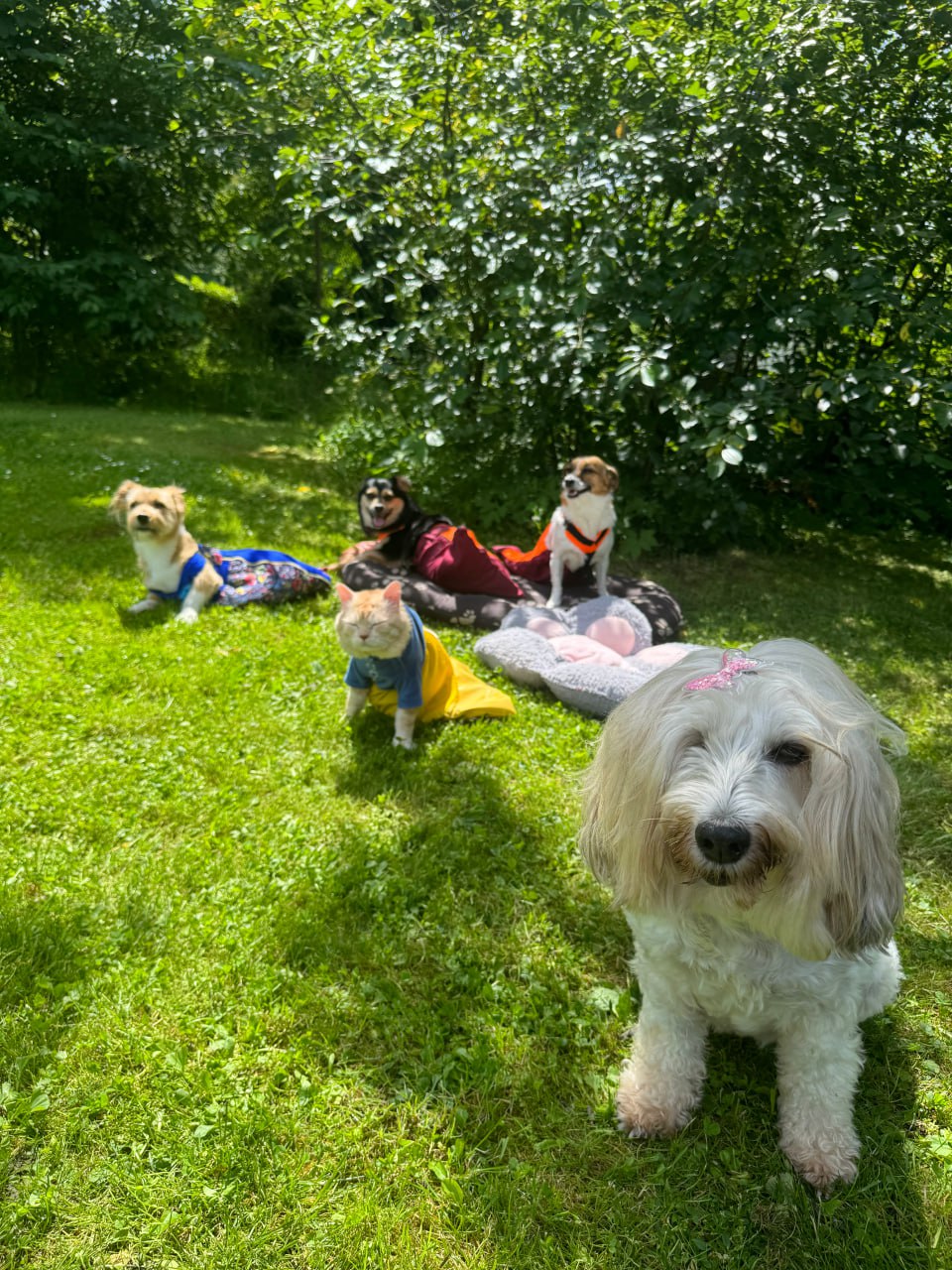 Жужа у нас уже немолодая собака. У нее есть четыре лапы, но нет одного глаза. Она очень любит не свой корм, а кошачий. Может сидеть и поджидать, когда появится еда для кошек. У кошек корм свободного доступа, а собаки едят по расписанию. Пряник и Бублик съедают все буквально за минуту, даже несмотря на специальные миски-лабиринты, которые должны замедлять кормление.