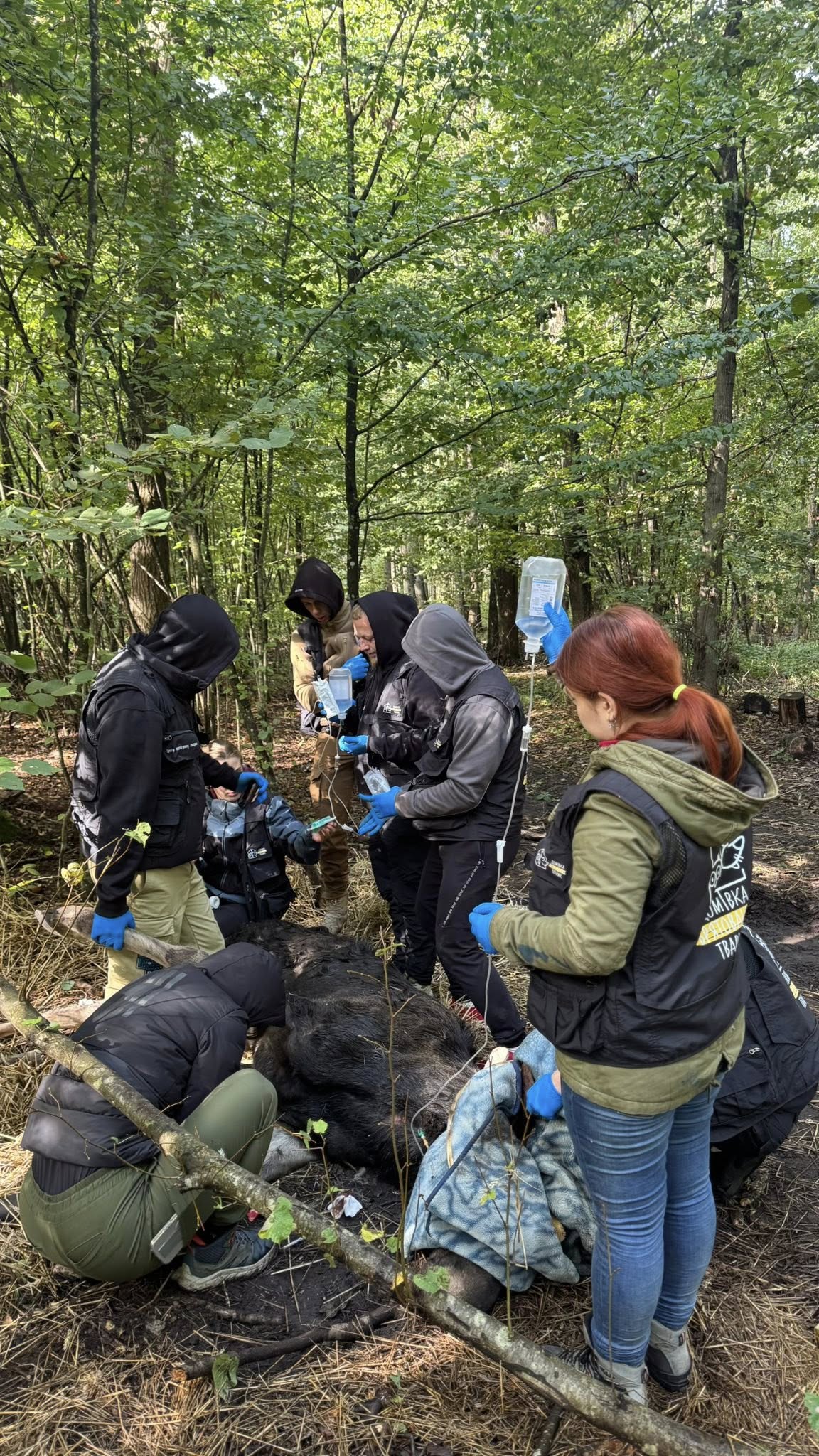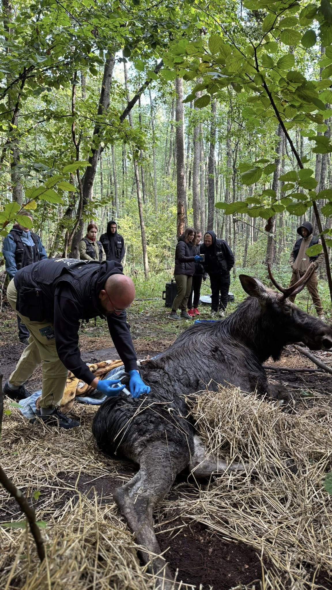 В чаще леса неподалеку от поселка Клевань (Ровенская область) неожиданно людно. Волонтеры, лесоводы, зоозащитники, ветеринары собрались вокруг лося, лежащего на земле. С животным случилась беда: не встает. Ветеринары ввели рогатого в медикаментозный сон с помощью седативных препаратов, подсоединили капельницы. Делают все для того, чтобы спасти парнокопытное животное от обезвоживания.