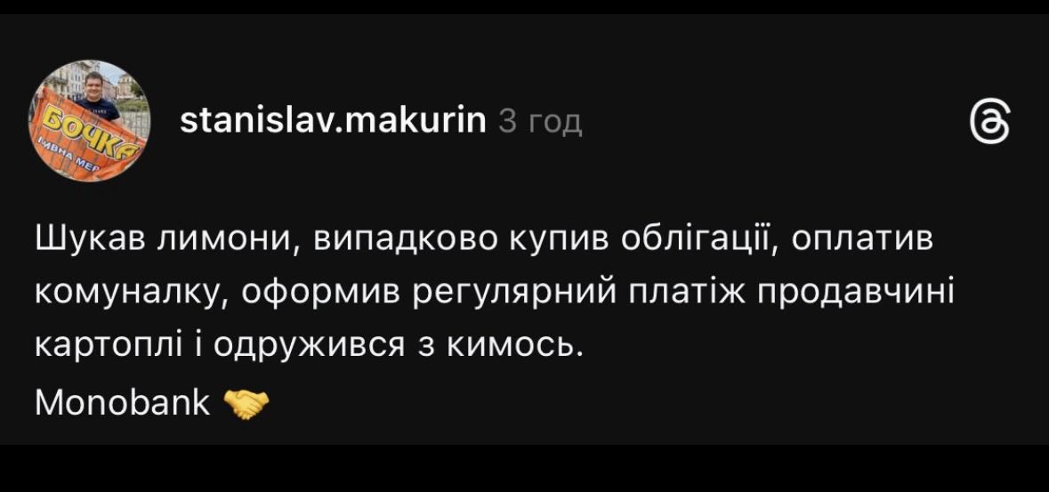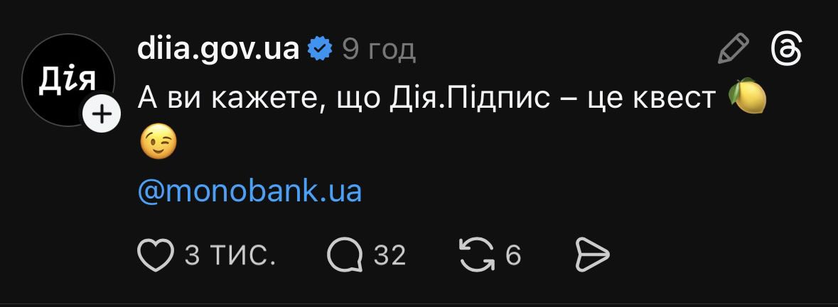Это еще нам повезло, что лимоны нужно в monobank.ua собирать, а не в "Дії". Так у вас просто будет прикольная салатница или банка «Живчика», а не жена/супруг, какие-то случайные штрафы, судимости и новое имя – принцесса Консуэла Бананагамок. (с) Андрей Домник