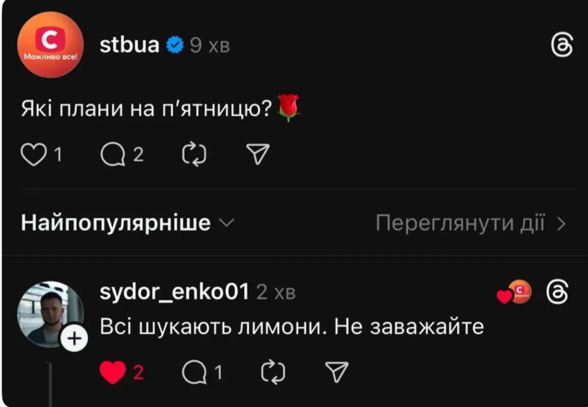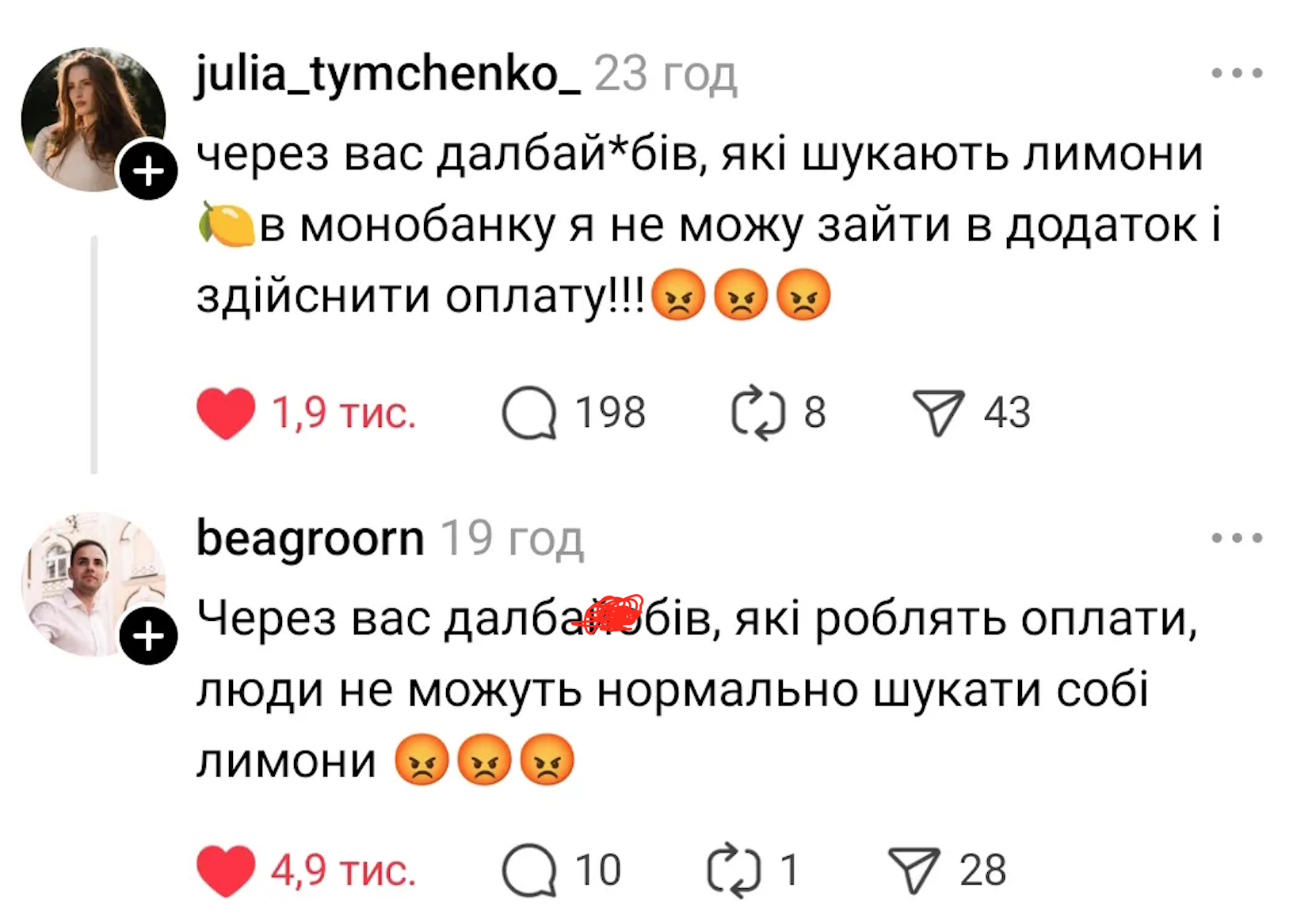 Среди этого безумия зашла и новость от блогера Ксюши Манекен, у которой мошенники украли более 6 миллионов гривен через Монобанк. И эту трагедию блогерши бессердечные украинцы тоже использовали для шуток. Ниже – результаты постов в Treads: все мнения только о лимонах.