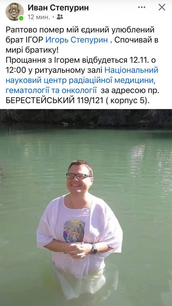 Церемония прощания с Игорем Степуриным пройдет 12 ноября в 12:00 в ритуальном зале Национального научного центра радиационной медицины, гематологии и онкологии, расположенном по адресу проспект Берестейский, 119/121 (корпус 5).
