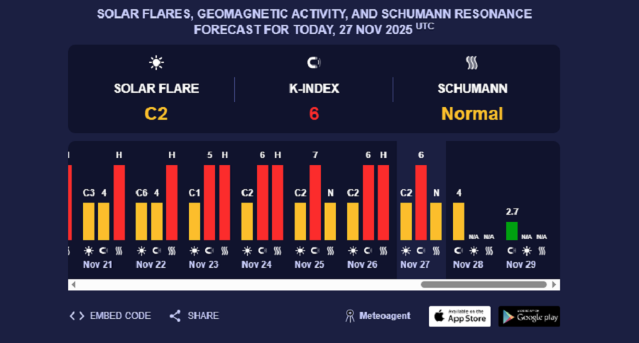 В четверг, 27 ноября, из-за вспышек на Солнце Землю накрыла мощная магнитная буря в 6 баллов, что соответствует сильным магнитным бурям, способным влиять на здоровье и самочувствие человека. Об этом сообщает сайт Meteoagent.