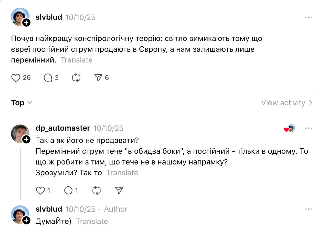 То, что электричества нет из-за российских обстрелов, казалось бы - очевидно. Но, оказывается, не для всех. В соцсетях и не только все время разгоняют "зраду", мол, света нет, потому что олигархи его продали за границу, а что не продали - то накопили в своих сейфах, а потом будут продавать по спекулятивным ценам.