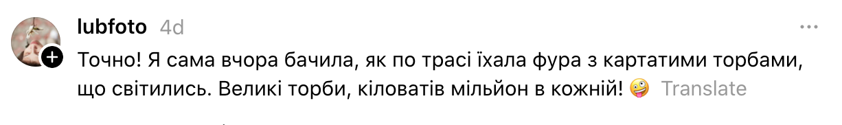 Ехала по дороге близ Львова, вдруг вижу – по правой полосе идут двадцать фур и все ярко светятся. Я остановилась и у местного деда спросила, что везут. А он говорит: "Это часто бывает, это электричество везут продавать в Европу. Фуры светятся, ночью спать мешают". (С) Алина Сарнатская