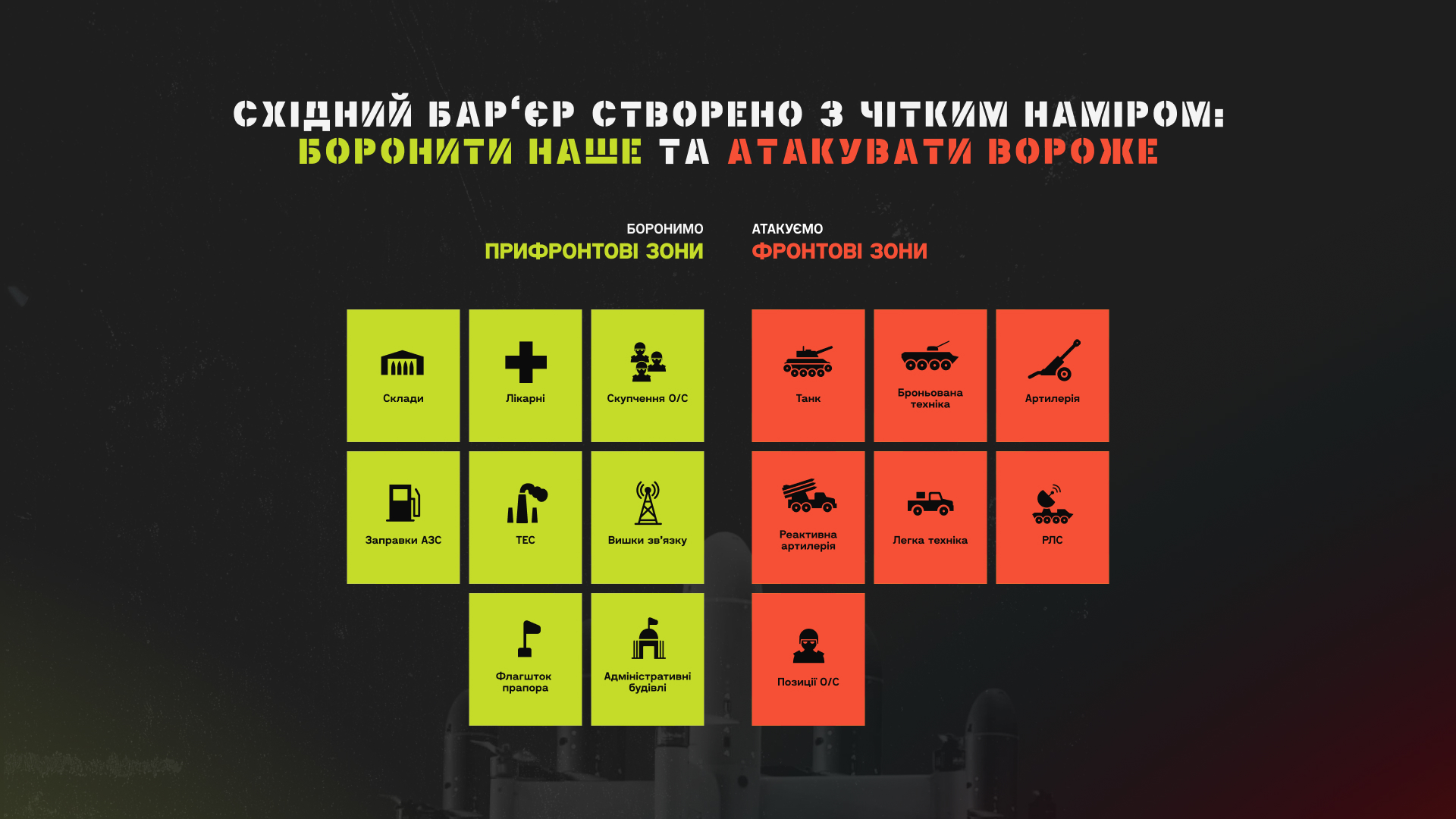 Оборона обеспечивается через оснастку подразделений дронами-перехватчиками и другими техническими средствами. Поражение – из-за применения ударных БПЛА среднего радиуса действия по средствам и маршрутам передвижения противника. Это позволяет качественно бить по логистике, сосредоточению техники и пехоте врага.