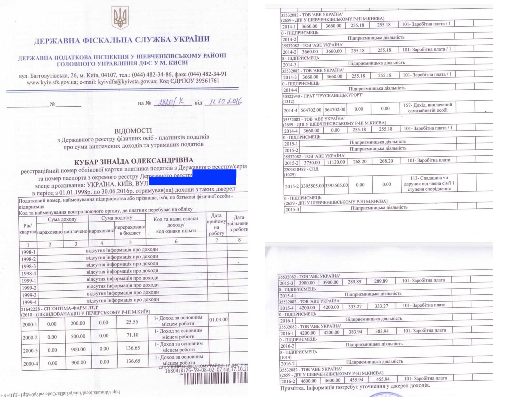 Теперь вернемся к вопросу финансовой независимости художницы, которая «никогда никому не платила, а только зарабатывала». Как видно из налоговых деклараций Зинаиды Кубар, копии которых есть в распоряжении редакции, за 2000-2016 годы включительно она имела довольно скромные официальные заработки.