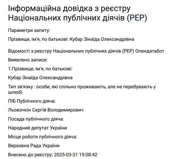 Еще в 2025 году имя Зинаиды Кубарь официально значилось в реестре Национальных публичных деятелей (PEP). Ведь если жила с политиком – добро пожаловать в мир финансовой дисциплины и прозрачности.