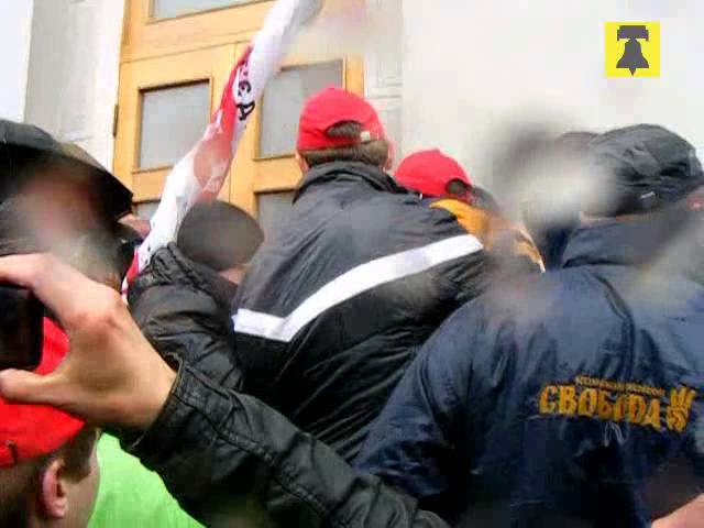 У входа в областной дом советов, где должна начаться сессия Черкасского областного совета, происходит потасовка. Ни журналисты, ни депутаты не могут пройти на сессию. Всем, кто хочет попасть в сессионный зал, приходится обходить здание с другой стороны. Однако там в холле облгосадминистрации - также милиционеры.