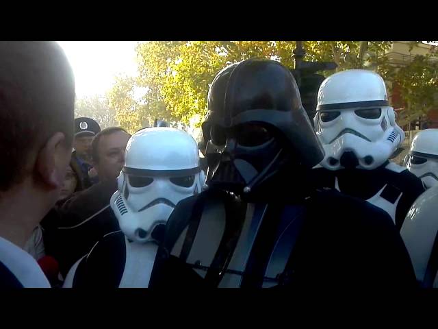 Персонажи киносаги "Звездные войны" решили не пропускать сегодняшнее заседание сессии Одесского горсовета, на котором рассматривали отставку мэра Одессы Алексея Костусева. Как передает корреспондент "Комсомольской правды в Украине" с места событий, темный лорд Дарт Вейдер со своими имперскими штурмовиками и мастером Йодой попытался прорваться в мэрию на заседание горсовета и объявить себя мэром вместо Костусева. Штурмовики и магистр Йода принесли Вейдера на носилках-помосте к зданию. Там ситх пообщался с журналистами, рассказав, что его назначил на пост городского головы император Палпатин и попытался пройти в мэрию. Однако его остановил начальник охраны.