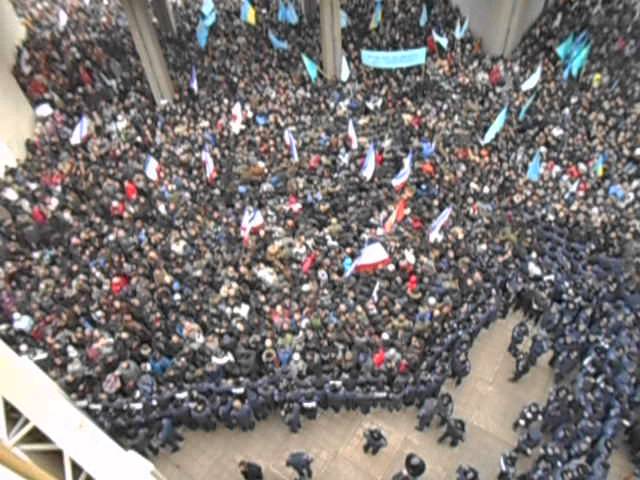 У Верховного Совета Крыма собрались тысячи крымских татар выступающих против отделения автономии от Украины и рассмотрения этой темы на сессии парламента 26 февраля. По некоторым подсчетам, митингующих порядка 5-6 тысяч человек. Крымские татары скандируют: "Крым – не Россия!" и "Героям Слава!".