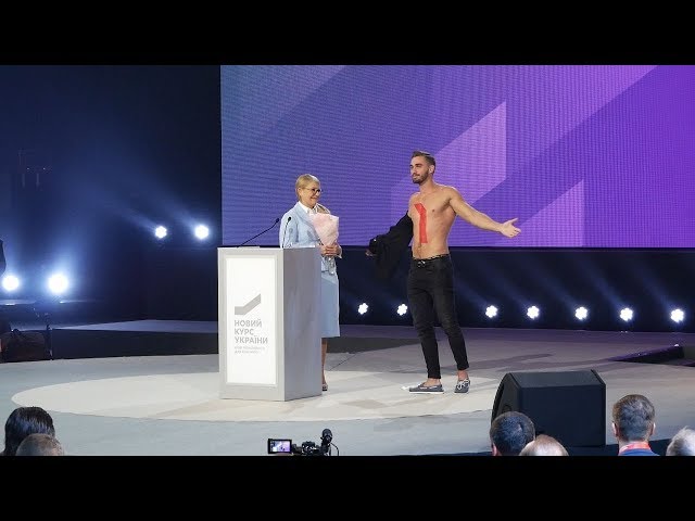 В пятницу, 15 июня, во время выступления лидера "Батьківщини" Юлии Тимошенко на форуме "Новый курс Украины" произошел конфуз. Неизвестный молодой человек вышел на сцену к политику, вручил ей цветы и разделся.