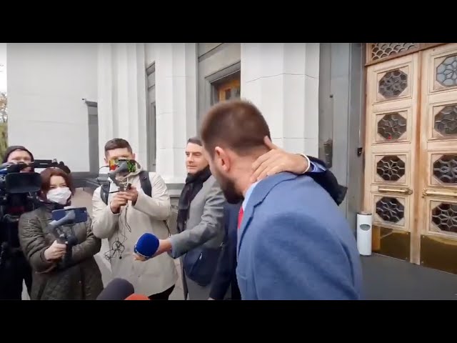 В этот момент упомянутый экс-"слугой" парламентарий проходил мимо и, видимо, успел услышать оскорбления в свой адрес. Лерос подошел к Юрченко и крепко прихватил его левой рукой за шею, после чего все же зашел в здание Рады.