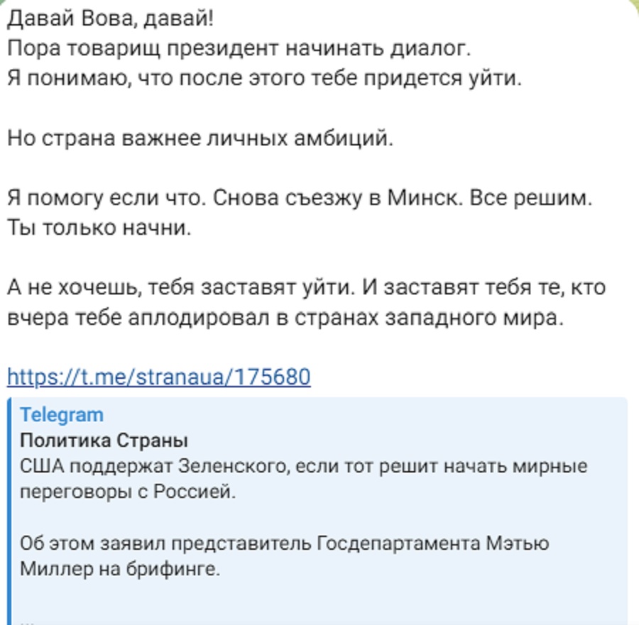 - Давай Вова, давай! Пора, товарищ президент, начинать диалог. Я понимаю, что после этого тебе придется уйти. Но страна важнее личных амбиций. Я помогу если что. Снова съезжу в Минск. Все решим. Ты только начни. А не хочешь, тебя заставят уйти. И заставят тебя те, кто вчера тебе аплодировал в странах западного мира, – написал Шевченко.