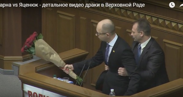 Олег Барна сперва вручил Арсению Яценюку букет роз, а потом попытался поднять премьер-министра и оттащить от трибуны. Фото: скриншот видео