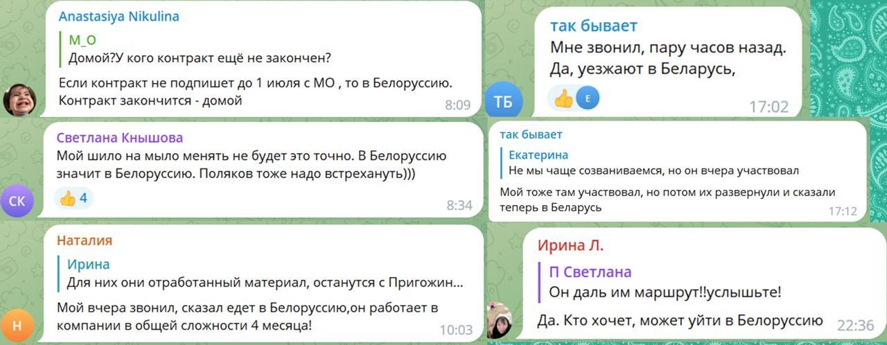 Информацию о том, что наемников отправят в Беларусь, подтверждают изданию и родственники «вагнеровцев». Одна из родственниц со ссылкой на своего знакомого сообщила, что оставшиеся в Ростове-на-Дону подразделения ЧВК "Вагнер" направляются в Беларусь. Еще одна собеседница издания рассказала, что ее муж, который находился в Ростове, сообщил ей об отправке в Беларусь, "скорее всего", но больше на связь не выходил.
