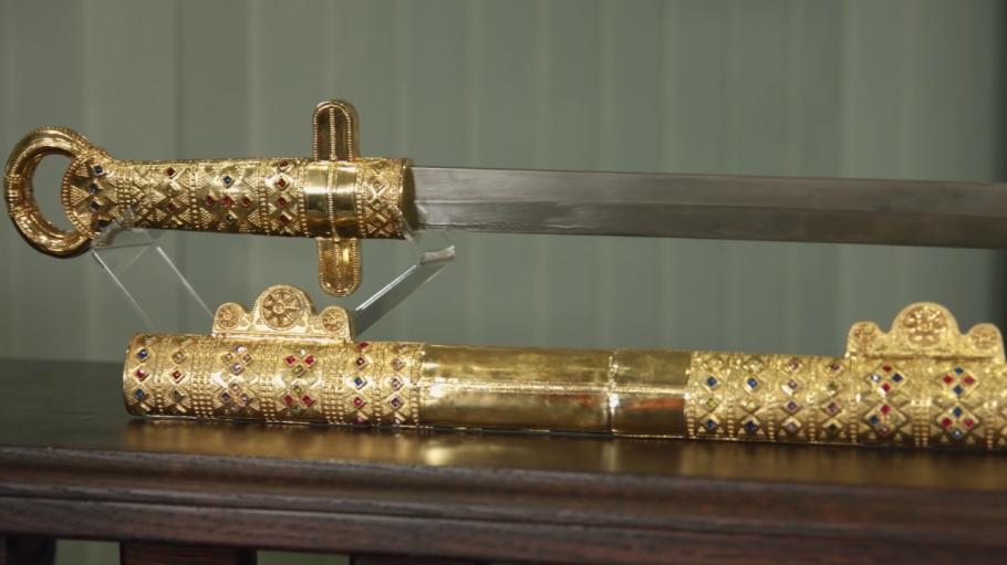 Меч является частью Перещепинского клада, который археологи нашли в 1912 году возле села Малая Перещепина недалеко от Полтавы. Сокровище состояло из 800 предметов, большинство из которых золотые, остальные – серебряные. Это самый богатый клад, найденный в Восточной Европе. В 1984 году немецкий археолог Йоахим Вернер заявил, что эти вещи принадлежат болгарскому хану Кубрату. Меч, копию которого подарили Зеленскому, и перстень хана Кубрата являются важными для болгар реликвиями. Они хранятся в российском музее. В 2019 году Россия предоставила их Болгарии для выставки.