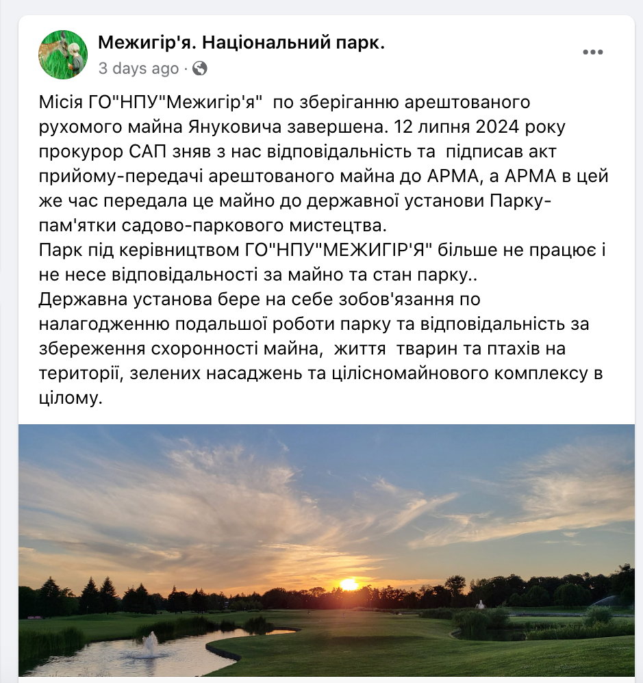 12 июля Национальный парк "Межигорье" сообщил, что их миссия по сохранению имущества президентской резиденции завершена. Скрин: facebook.com/mnporgua