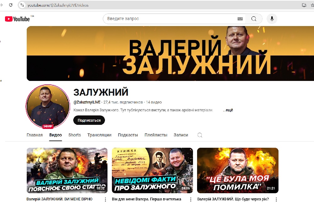 На платформе YouTube появился канал под именем экс-главнокомандующего Вооруженными силами Украины Валерия Залужного.