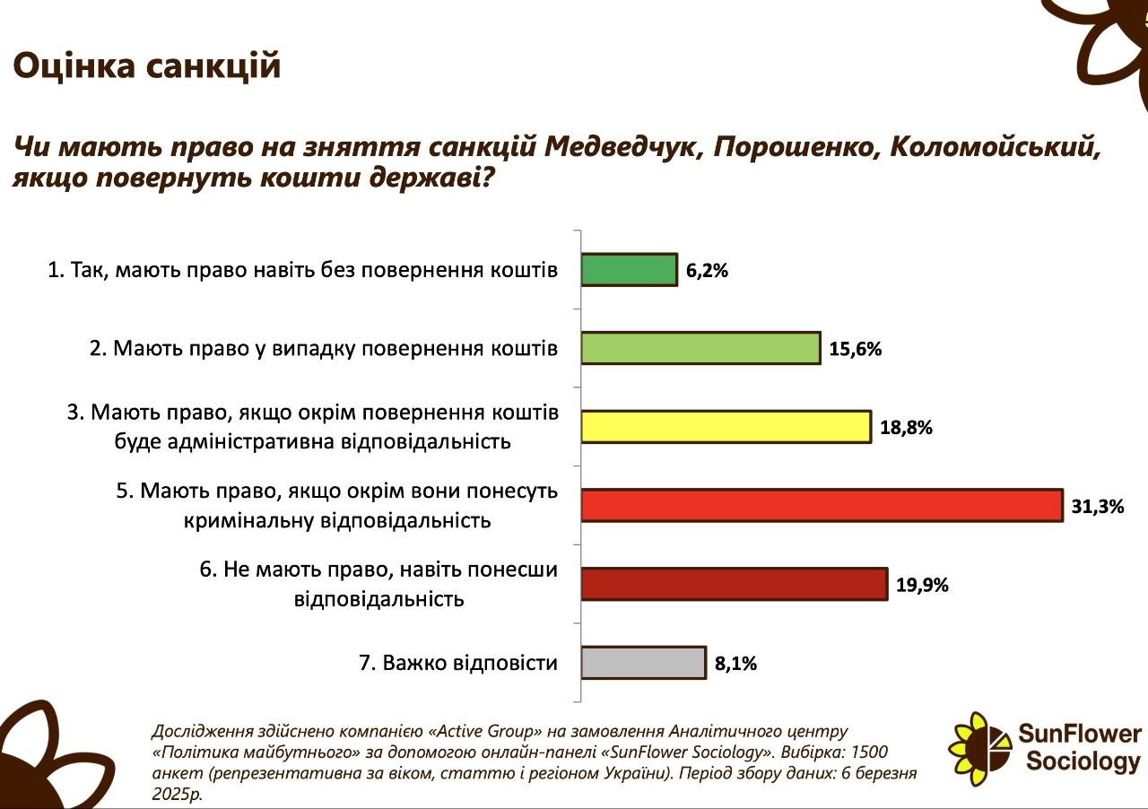Также 50,1% украинцев считают, что снятие санкций возможно только после понесения указанными политиками и олигархами юридической ответственности, в том числе 31,3% опрошенных настаивают на уголовной ответственности.