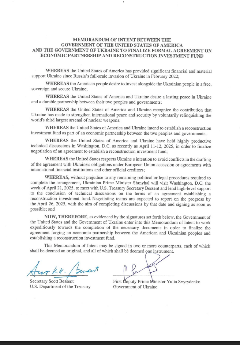Поскольку без ущерба для любых других политических или юридических процедур, которые остаются необходимыми для завершения этого соглашения, премьер-министр Украины Денис Шмыгаль совершит визит в Вашингтон на неделе 21 апреля 2025 года, чтобы встретиться с министром финансов США Бессентом и оказать поддержку на высоком уровне по завершению технических обсуждений условий соглашения о создании инвестиционного фонда реконструкции.