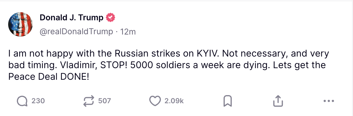 – Мне не нравятся российские удары по Киеву. Они не нужны и имеют очень неудачное время. Владимир, остановись! Еженедельно погибает 5000 солдат. Давайте заключим мирное соглашение! – написал Трамп.
