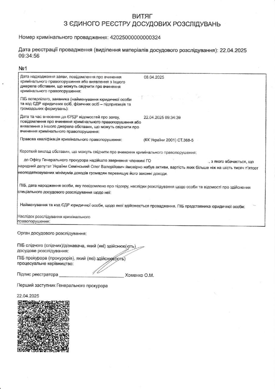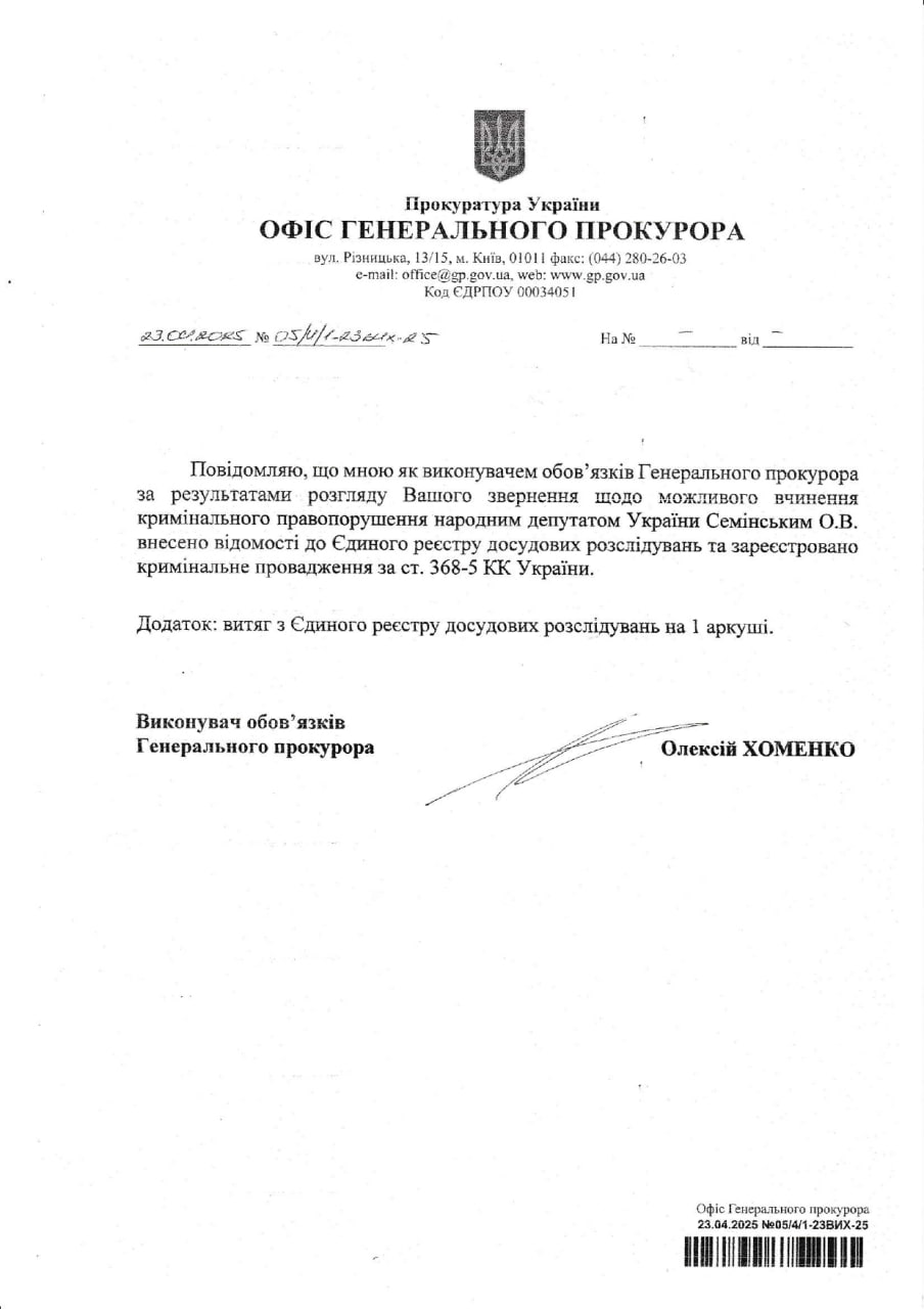 И.о. Генерального прокурора Алексей Хоменко в апреле текущего года внес в Единый реестр досудебных расследований уголовное производство № 4202500000000324 с правовой квалификацией ст.368-5 Уголовного кодекса Украины в отношении народного депутата Олега Семинского и поручил осуществлять досудебное расследование детективам НАБУ.